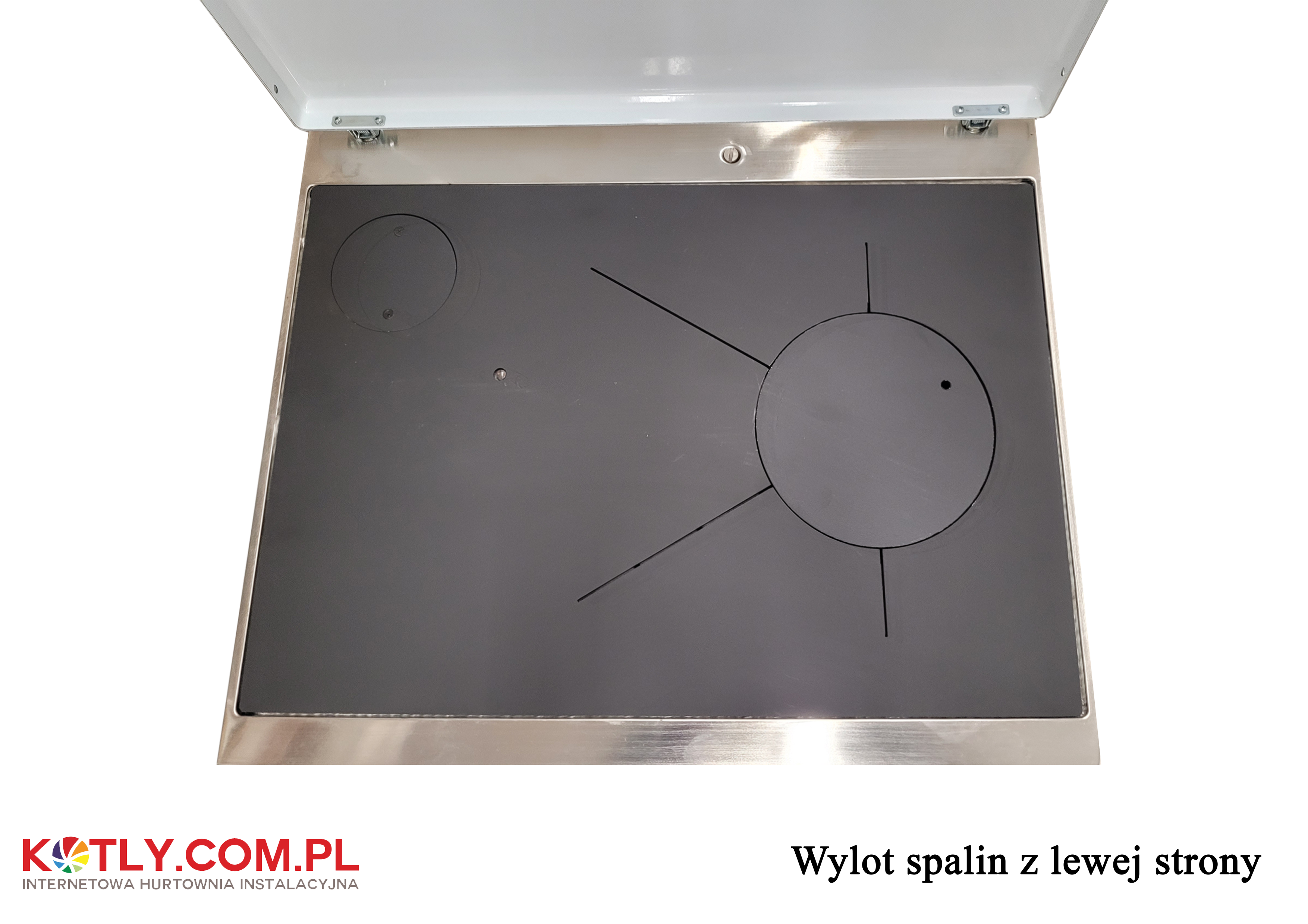 Kuchyň levá: výstup spalin bude vzadu na levé straně a na levé boční stěně, zatímco ohnisko se bude nacházet na pravé straně