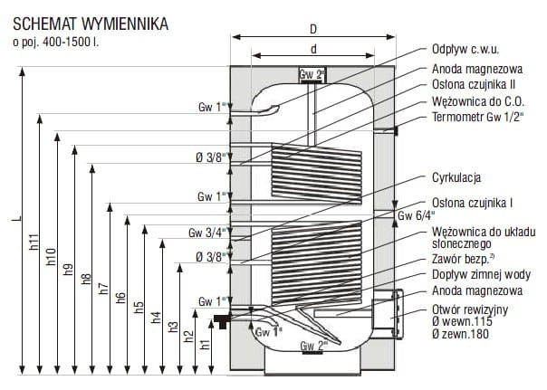 Vertikální výměník určený k ohřevu teplé užitkové vody (teplé vody) s využitím dvou zdrojů energie. Sluneční energie je ekologická a poskytuje nám teplo po celý rok a může sloužit jako hlavní zdroj tepla. Jako druhý zdroj tepla, podporující solární systém v zimním období, lze využít ekologický kotel na teplou vodu. Dolní hadice je určena k připojení solární instalace, horní k instalaci otopného systému. Ohřev vody může probíhat také pomocí topné spirály umístěné v revizní otvor (doplňkové vybavení).