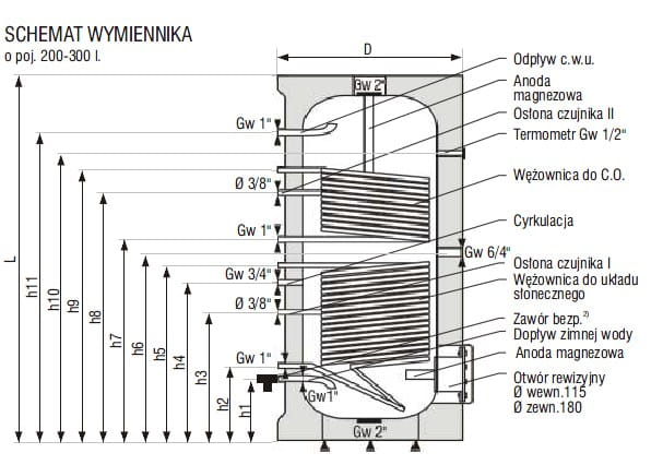 Vertikální výměník určený k ohřevu teplé užitkové vody (TUV) využívající k tomu dva zdroje energie. Sluneční energie je ekologická a dodává nám teplo po celý rok a může sloužit jako hlavní zdroj tepla. Jako druhý zdroj tepla, podporující solární systém v zimním období, lze využít ekologický kotel na topnou vodu (c.o.). Spodní hadice výměníku je určena k připojení solární instalace, horní k instalaci topné vody. Ohřev vody může probíhat také pomocí topné patrony umístěné v revizní otvor (dodatečné vybavení).