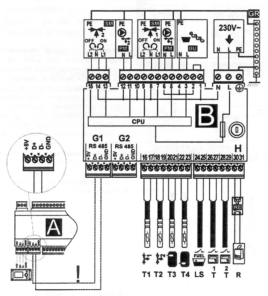 Die Klemmen mit den Nummern 1-15 sind für den Anschluss von Geräten mit Netzspannung 230V~ vorgesehen. Die Klemmen 16-31 sind für die Zusammenarbeit mit Niederspannungsgeräten (unter 12V) vorgesehen.