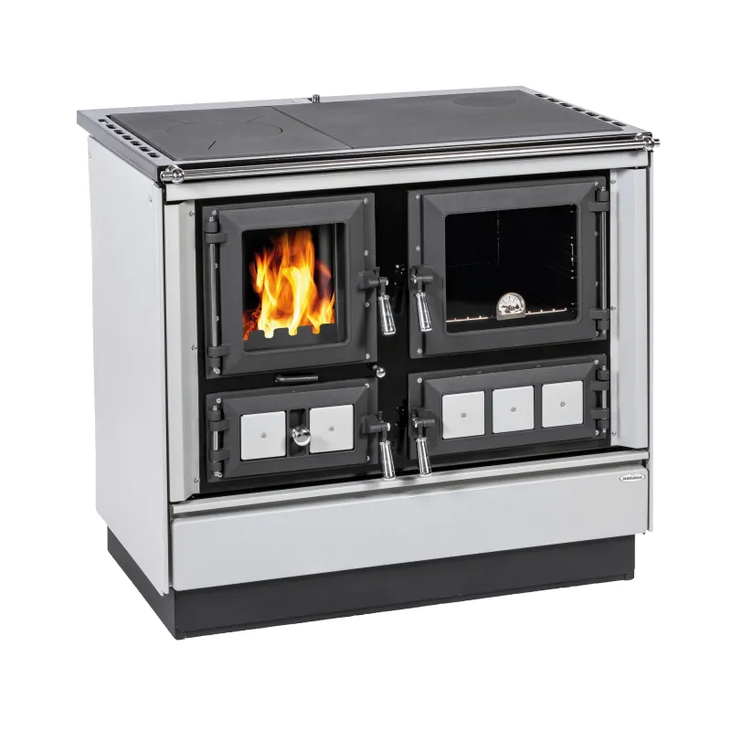 Der Herd verfügt über einen größeren Feuerraum auf Kosten der Backofengröße, die im Vergleich zu den Modellen 9100 und 9103 kleiner ist. Trotz der geringeren Abmessungen ist der Backofen voll funktionsfähig und mit einem Rost sowie einem Backblech ausgestattet. Die große Feuerraumtür ermöglicht das Einlegen von Holzscheiten mit einem Durchmesser von bis zu 190 mm und einer Länge von bis zu 450 mm. Daher ist dieses Modell ideal, wenn das Heizen Vorrang vor Kochen oder Backen hat.