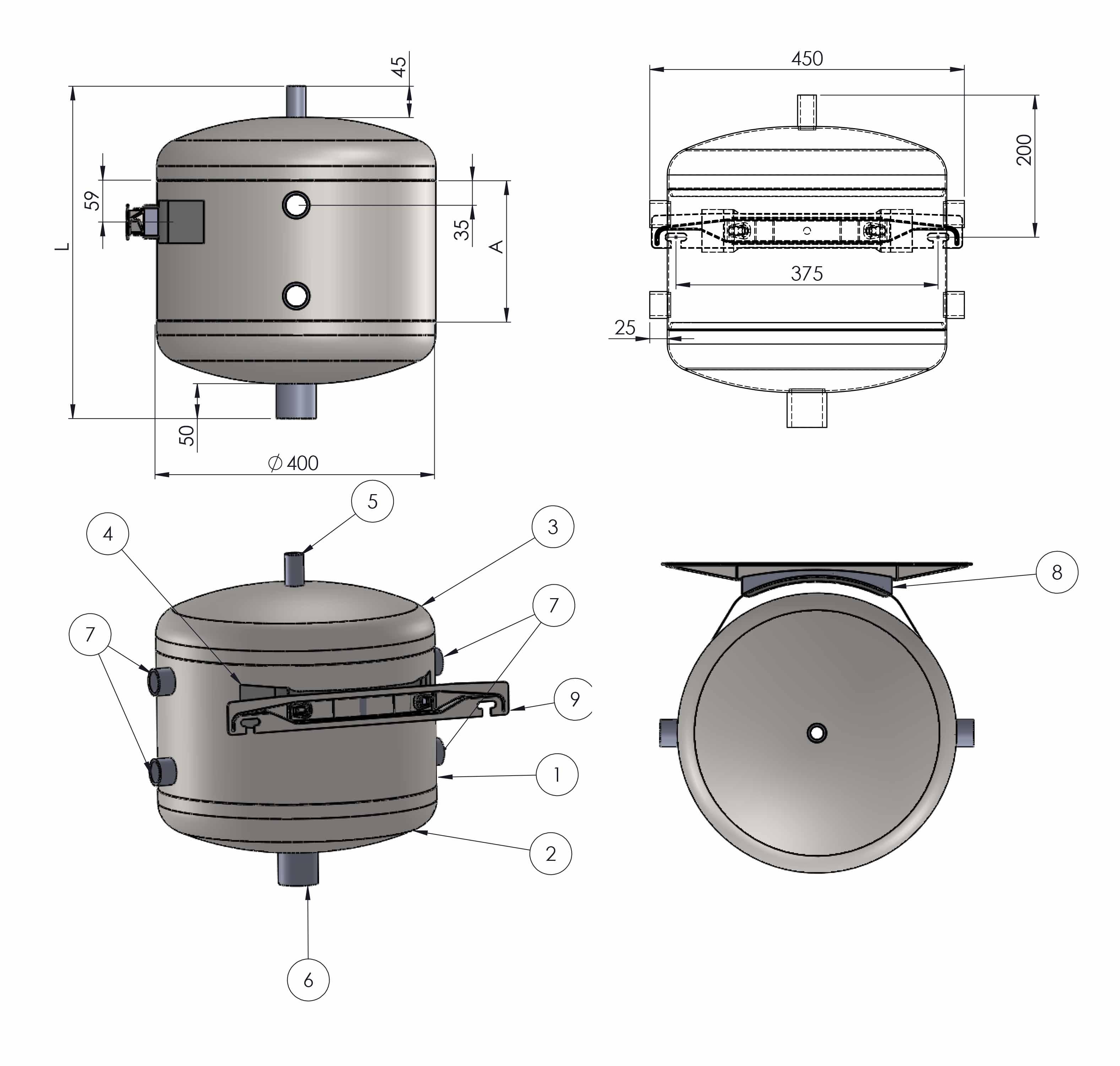 | Inhalt [l] | Gesamtlänge - L [mm] | Abmessung A [mm] |