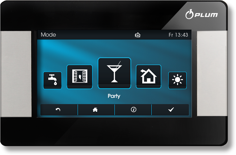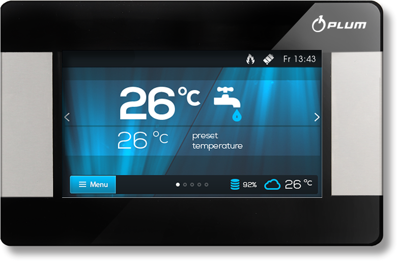 Der Raumregler des Unternehmens PLUM ist ein TOUCH-Screen-Gerät, bei dem Drehknöpfe und Tasten durch einen berührungsempfindlichen farbigen Flüssigkristallbildschirm ersetzt wurden. Die Verwendung von ecoSTER TOUCH ermöglicht die maximale Nutzung aller Softwarefunktionen des Heizungskesselreglers PLATINUM ecoMAX 860 P.