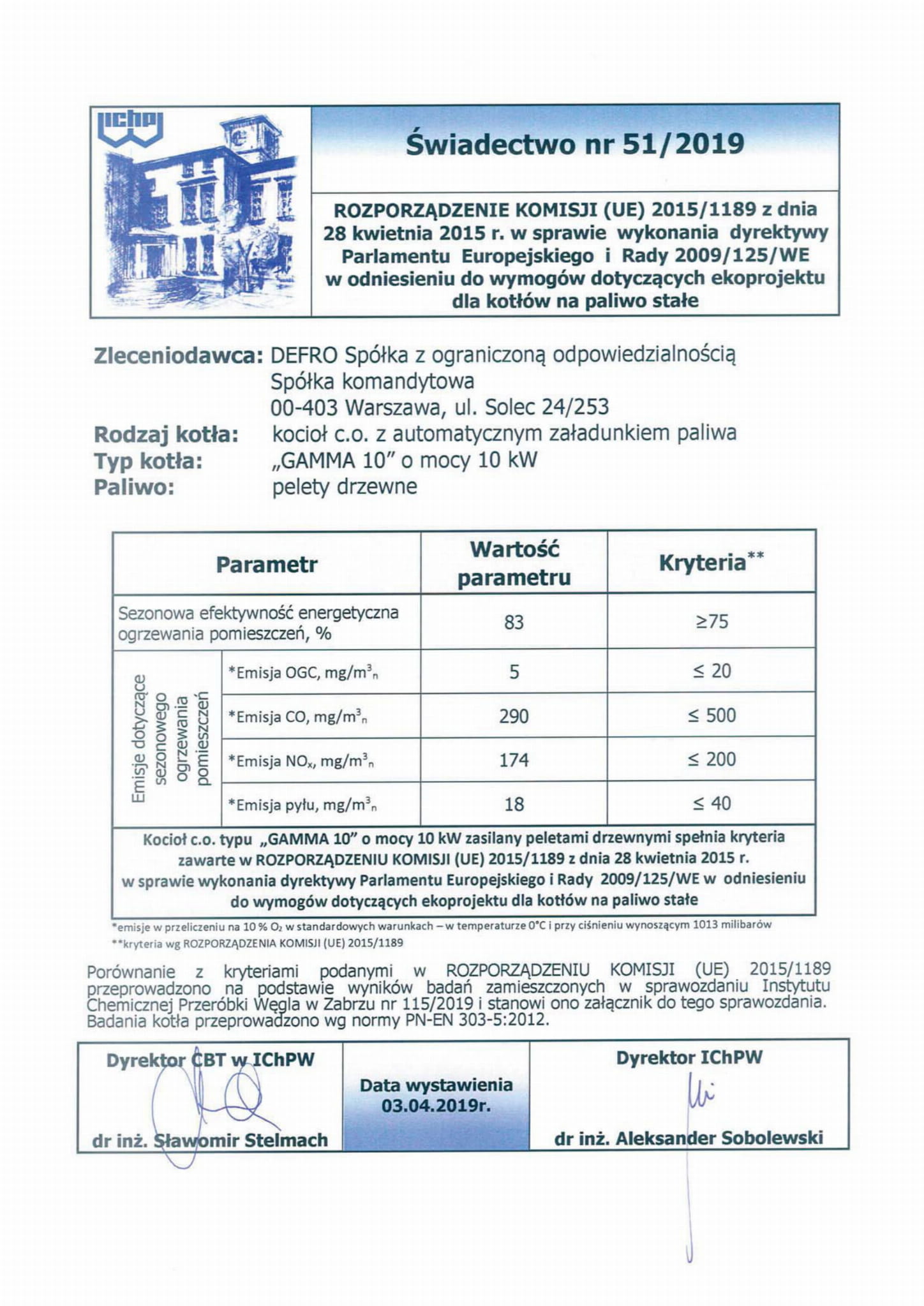 DEFRO GAMMA is a boiler installed in central heating systems. This boiler has class 5 emission according to PN EN 303-5:2012 standard and an ECODESIGN Certificate (ecodesign). Possession of this certificate and class 5 emission allows you to apply for a subsidy for its purchase and installation. During the production process, a pellet burner was used which has a self-cleaning function and an automatic fuel ignition system as standard. A spacious fuel tank allows operation without refueling with pellets for several days, which is facilitated by the use of ceramic catalysts that stabilize the combustion process. The heat exchanger was made from high-grade boiler steel. The shape of the heat exchanger ensures high efficiency and ease of cleaning. Thanks to its innovative structure, it is equipped with the possibility of relocating the fuel tank to the other side. It also has an ADAPTIVE CONTROL controller, which allows for boiler operation adjustment based on air flow through the heat exchanger. It also supports 4 heating system pumps, hot water, valve, control of one mixing valve, monitoring and changing parameters of the main controller online.