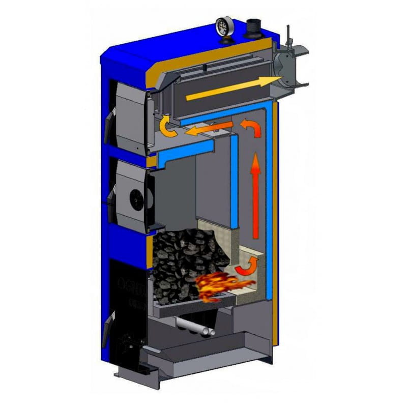 Ogniwo Classic DS boiler is device designed to heat both domestic hot water and central heating water. An integral part is an accumulation tank, which must be operated together with the boiler. The fuel used in the combustion process is coal, which is delivered to the boiler by hand through the back fill door. To fully optimize the combustion process, the incoming air is regulated by means of throttle the lower door, which can be adjusted manually or by a thrust gauge, centre door damper, as well as by two secondary air dampers.