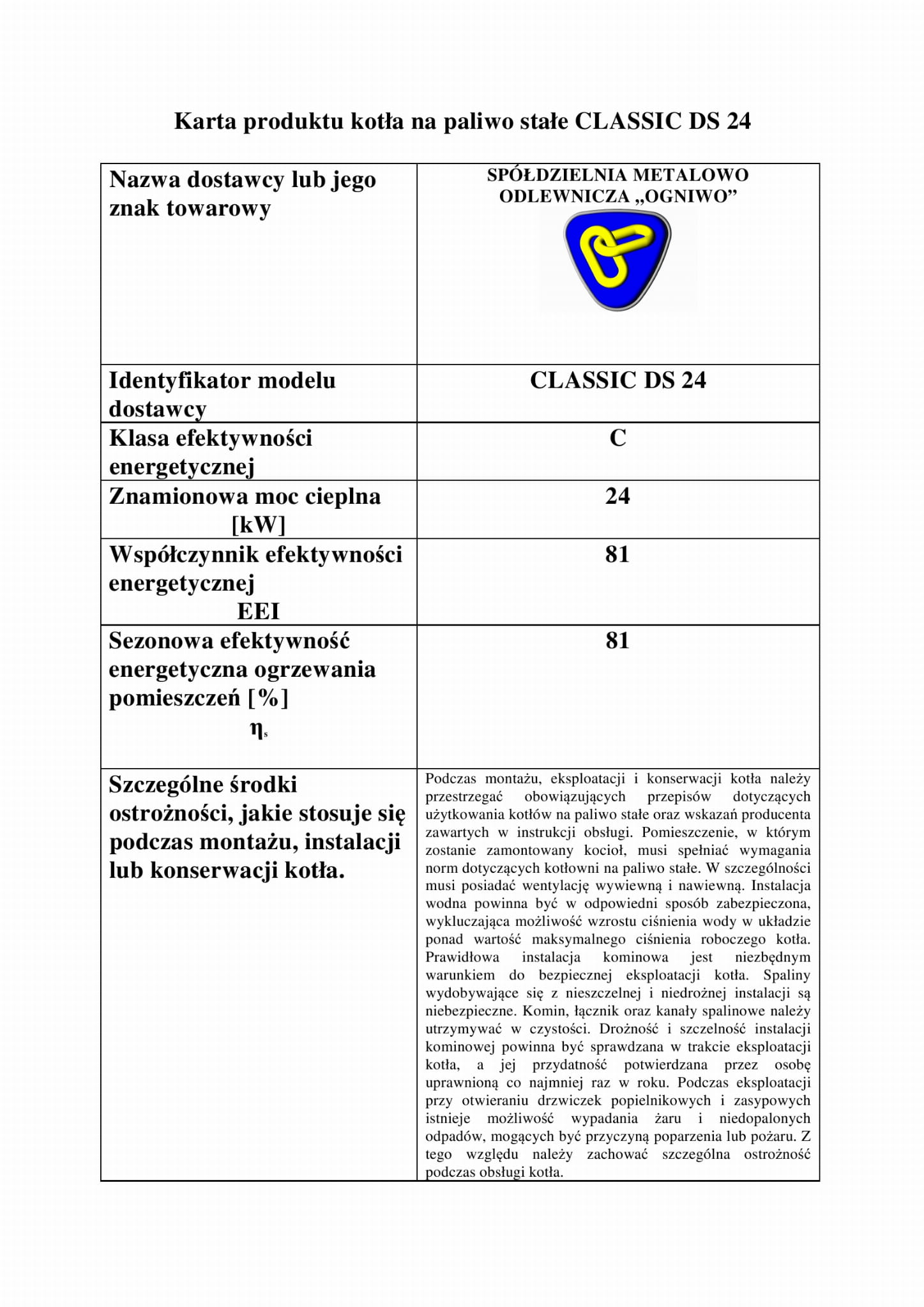 Parameter Unit Boiler Classic DS 10 kW Boiler Classic DS 13 kW Boiler Classic DS 18 kW Boiler Classic DS 24 kW