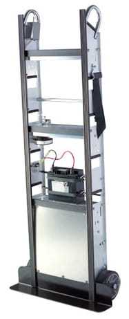 It has a very simple lifting mechanism in its construction for raising the transporter together with the boiler. Rubber-metal paws located on both sides at the back allow for resting on stairs regardless of the material they are made of. The paws raise or lower the entire transporter so that the transport wheels do not touch the step edge and the construction or height of the steps does not matter. This solution protects the step from damage unlike when using transporters equipped with caterpillar tracks. The entire device operation is controlled by a single switch. The equipment includes a safety belt which secures the boiler against tilting or sliding off the transport plate. The transporter is equipped with a brake which prevents the entire device from sliding off the step edge.