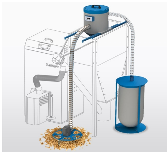 The transporter is designed to be installed on any pellet hopper whose width or length does not exceed 1.5m. The telescopes of the transporter can be extended to this width. The maximum length of the intake hose is 15m.