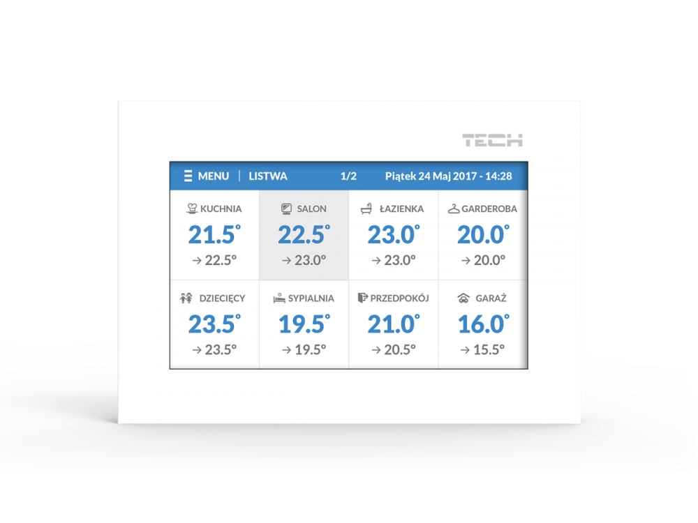 - Każda ze stref może mieć przypisany swój indywidualny tryb pracy (stała temperatura, ograniczenie czasu lub 6 różnych harmonogramów pracy)