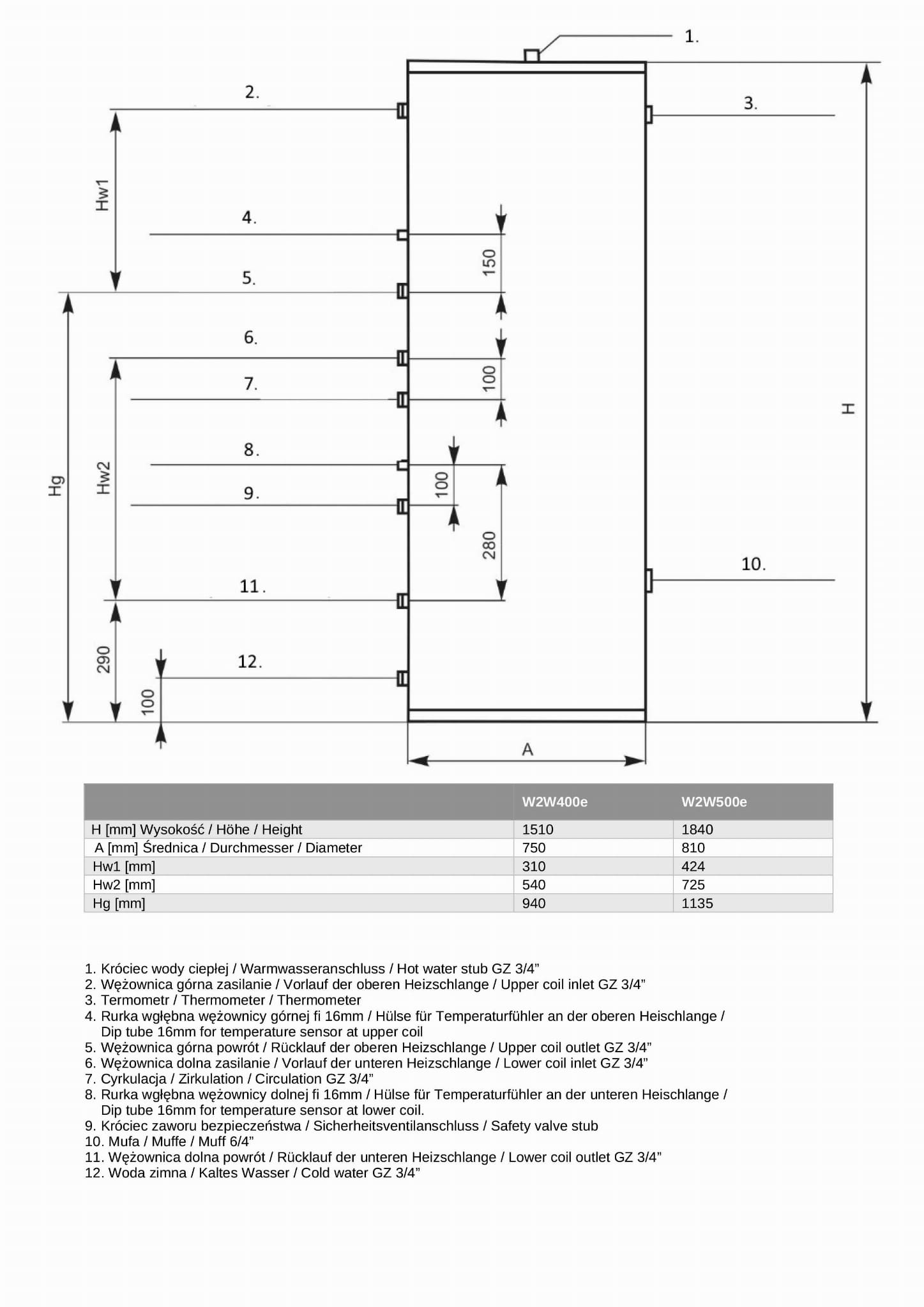 | Wysokość z króćcem górnym [mm] | 1290 | 1495 | 1775 | 1510 | 1840 | 2050 | 2200 | 2000 |
