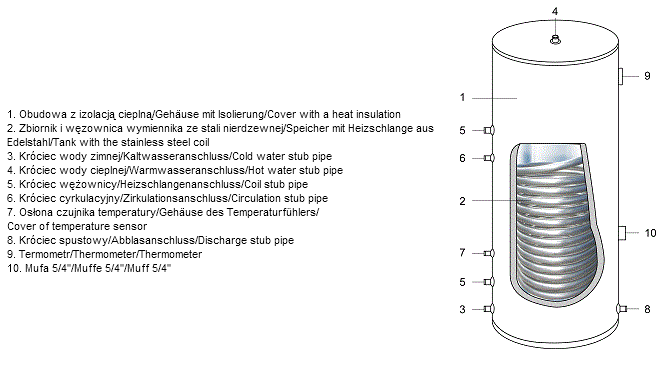 • Stal nierdzewna – zarówno zbiornik, jak i wężownica wykonane są z materiałów odpornych na korozję, co zapewnia długą żywotność i higieniczne użytkowanie.