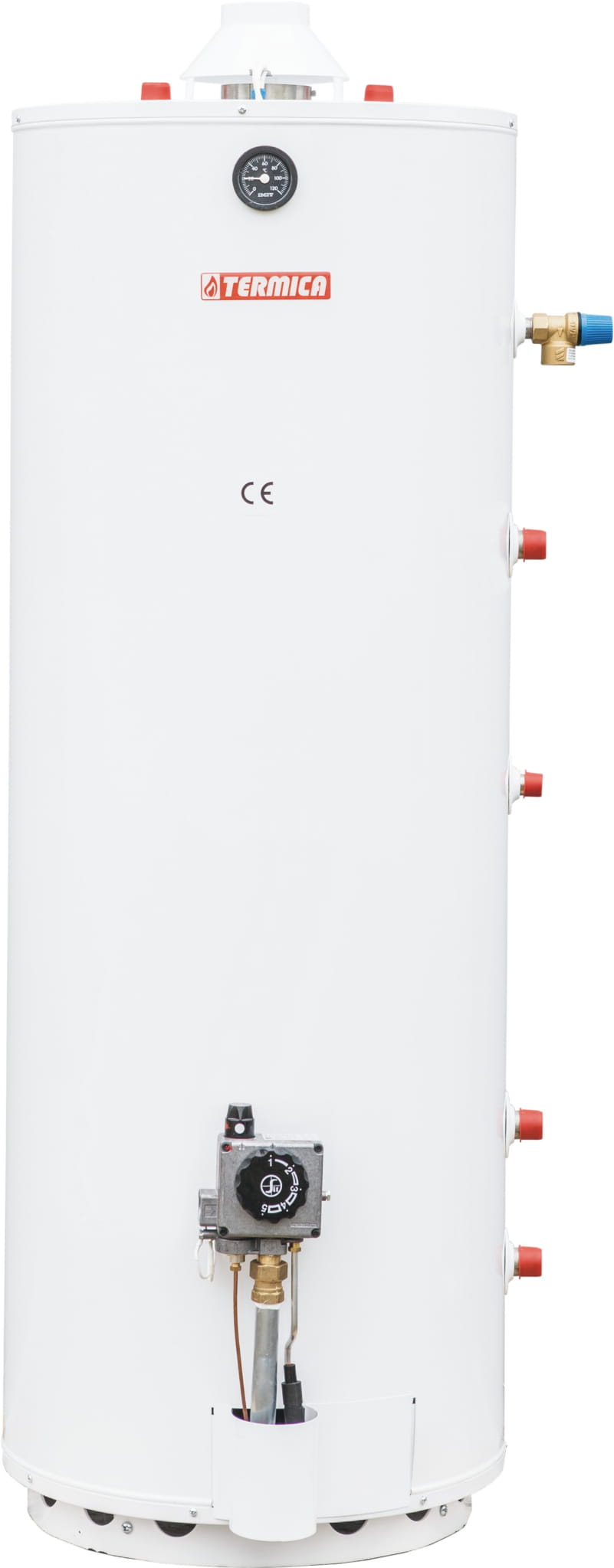 Podgrzewacze gazowe Termica PSW z wężownicą to uniwersalne i oszczędne rozwiązanie na cały rok. W okresie zimowym wężownica pozwala na podgrzewanie wody za pomocą kotła C.O., natomiast w okresie letnim woda podgrzewana jest przy użyciu własnego palnika gazowego. Pod stalową obudową i izolacją umieszczony jest zbiornik ze stali nierdzewnej. Termica PSW posiada szereg zabezpieczeń jak na przykład urządzenie odcinające dopływ gazu w sytuacji kiedy zgaśnie płomień, czujnik zaniku ciągu kominowego z limiterem zabezpieczającym przed zagotowaniem wody oraz fabrycznie montowany zawór bezpieczeństwa.