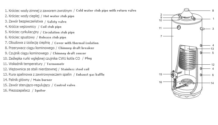 Podgrzewacze gazowe Termica PSW z wężownicą to uniwersalne i oszczędne rozwiązanie na cały rok. W okresie zimowym wężownica pozwala na podgrzewanie wody za pomocą kotła C.O., natomiast w okresie letnim woda podgrzewana jest przy użyciu własnego palnika gazowego. Pod stalową obudową i izolacją umieszczony jest zbiornik ze stali nierdzewnej. Termica PSW posiada szereg zabezpieczeń jak na przykład urządzenie odcinające dopływ gazu w sytuacji kiedy zgaśnie płomień, czujnik zaniku ciągu kominowego z limiterem zabezpieczającym przed zagotowaniem wody oraz fabrycznie montowany zawór bezpieczeństwa.