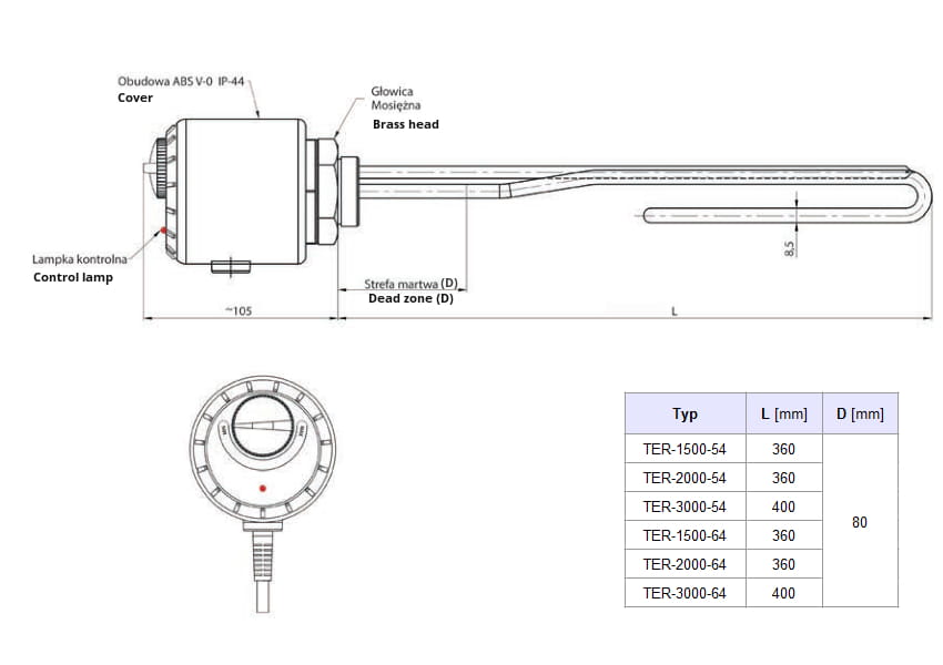 - Grzałka standardowo wyposażona w przewód zasilający z wtyczką o długości 1500mm.