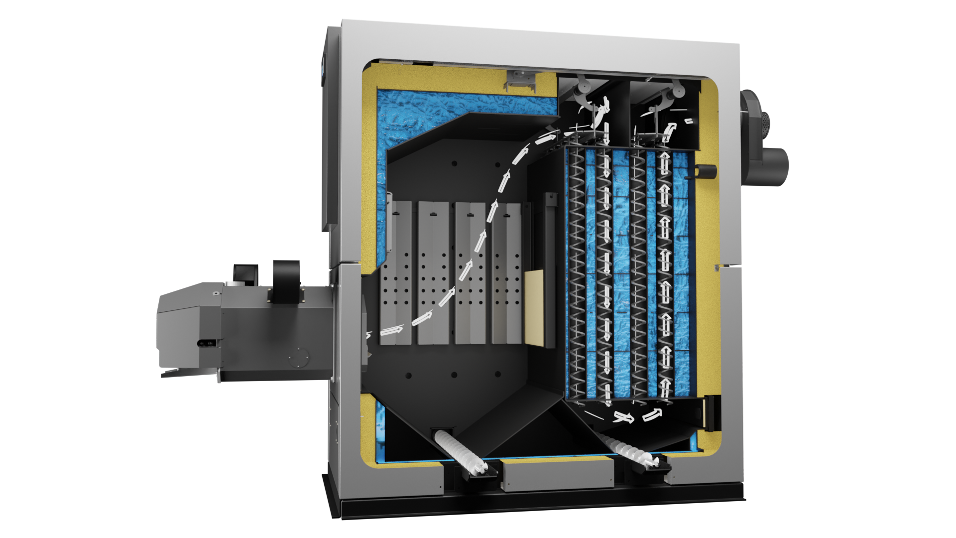 Do kotła zastosowano ślimaki, które są odpowiedzialne za odprowadzanie popiołu z kotła na zewnątrz. Popiół jest transportowany do specjalnych szczelnych pojemników. Dzięki temu w kotle utrzymywane są odpowiednie parametry.