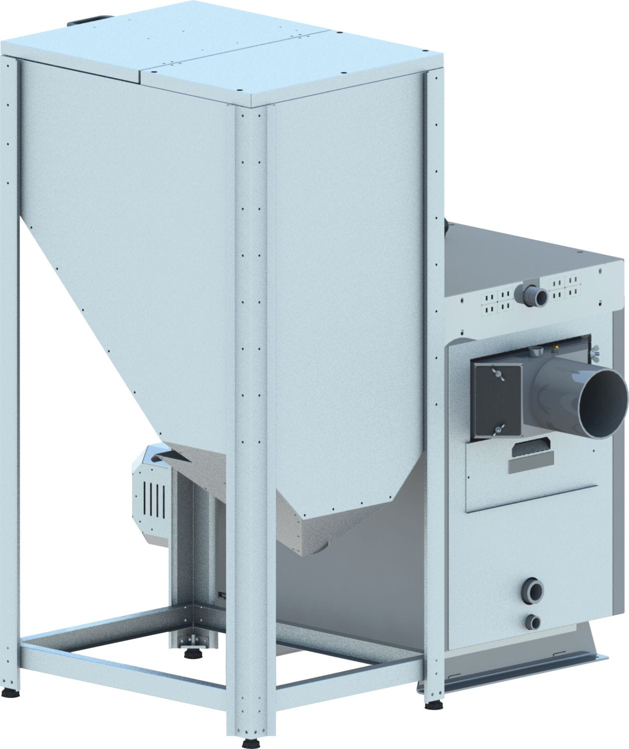 Kocioł wyposażony został w samoczyszczący palnik wrzutkowy z ceramiczną zapalarką do pelletu. Pojemność zasobnika pozwala przy pełnym zasypie na pracę przez długi okres czasu. Korpus kotła wykonany został z wysokogatunkowej, atestowanej stali kotłowej P265H. Konstrukcja wymiennika umozliwia osiągnięcie wysokiej sprawności. Dla bezpieczeństwa użytkownika na drzwiczkach zamontowane są wyłączniki krańcowe, które po otwarciu drzwiczek przerywają prace wentylatora i podajnika paliwa. Palnik został wyposażony w system automatycznego odpopielania rusztu.