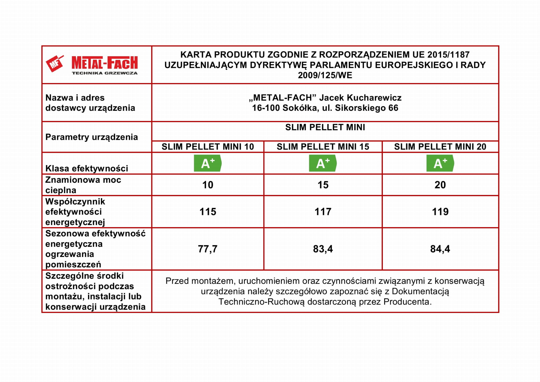 Nominalna moc cieplna [kW] 10 15 20