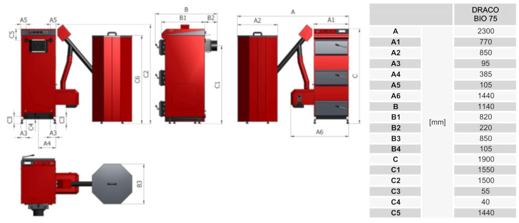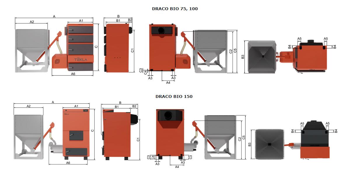 Konstrukcja kotła DRACO BIO została oparta na bardzo wydajnym wymienniku jedno paleniskowym. Zamiast palnika retortowego seria kotłów BIO wykorzystuje unikalnej konstrukcji palnik na pelet wykonany ze stali żaroodpornej. Dopływ powietrza potrzebnego do spalania zapewniają otwory znajdujące się na ruszcie palnika, powietrze dostarczane jest przez dmuchawę zamontowaną bezpośrednio do mieszacza powietrza. Wymiennik kotła wykonany jest z bardzo dobrej jakości, atestowanej stali o grubości 8 mm (DRACO BIO 12kW - 5 mm). Należytą pracą kotła steruje nowoczesny regulator elektroniczny z dużym, czytelnym ekranem LCD.