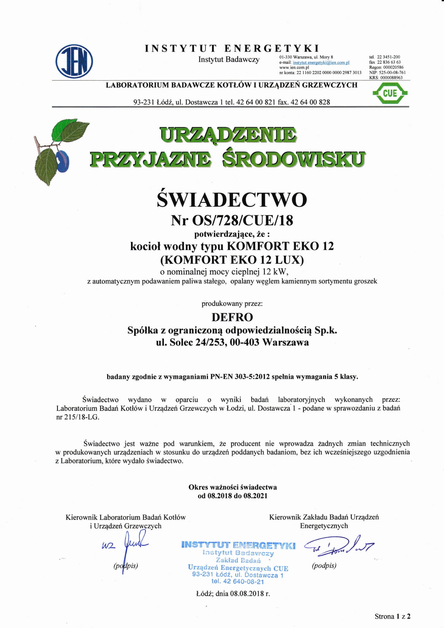 Kotły spełniają wymagania energetyczno-emisyjne klasy 5. normy PN EN 303-5:2012 oraz posiadają Certyfikat Ecodesign.