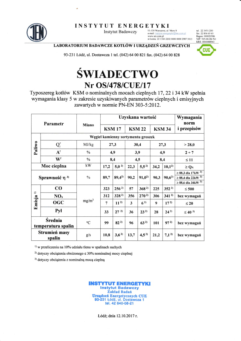| 5 KLASA wg PN EN 303-5:2012 | TAK | ||