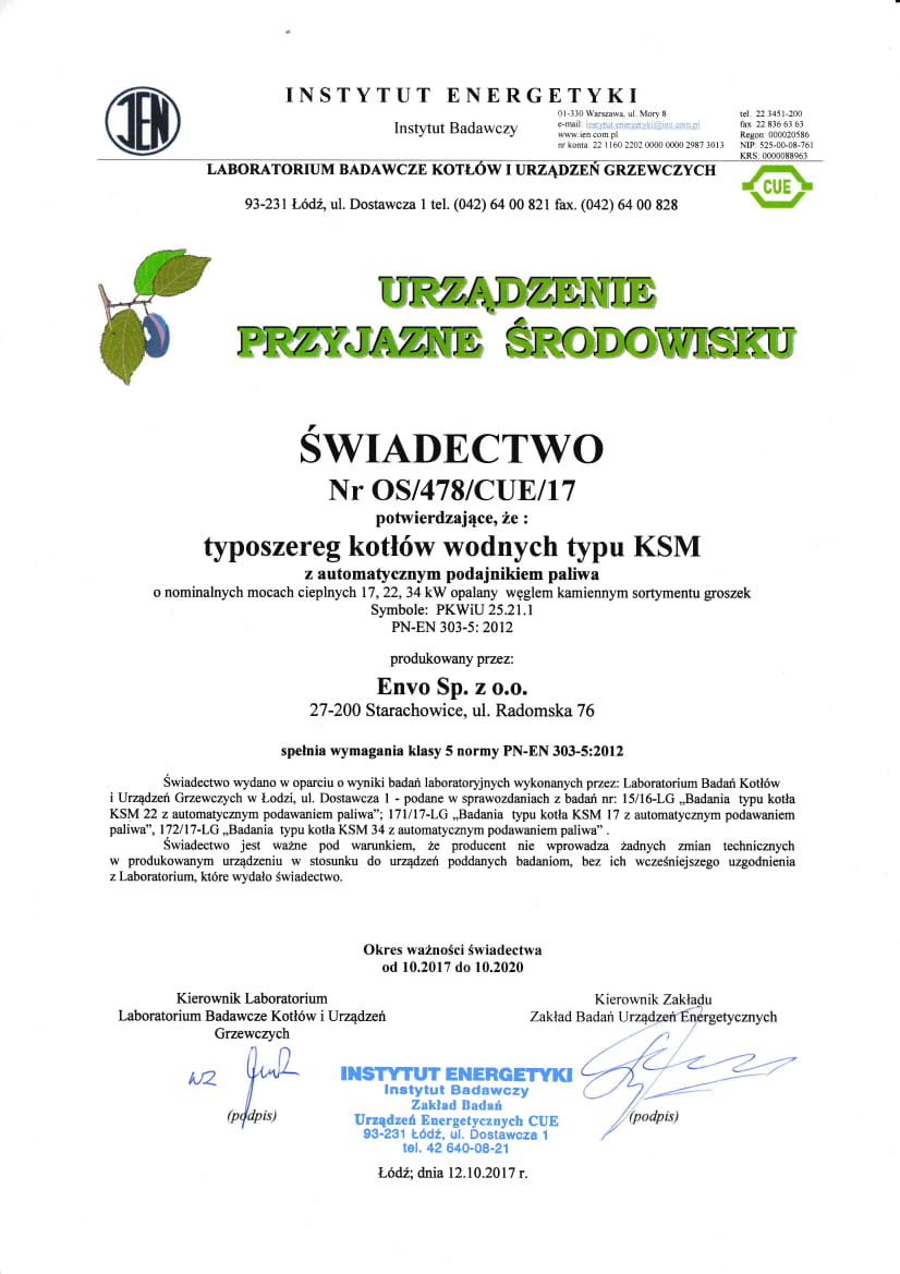 Kocioł KSM jest nowoczesnym kotłem centralnego ogrzewania z podajnikiem retortowym PSR, w którym jako paliwo podstawowe stosuje się ekogroszek uzyskiwany z węgla kamiennego. Konstrukcja wymiennika posiada pionowy układ kanałów spalinowych, co wpływa na wysoką sprawność urządzenia sięgającą 90%. KSM spełnia wymagania energetyczno-emisyjne klasy 5. według normy 303-5:2012. Oznacza to, że kocioł KSM jest urządzeniem, które wyróżnia się niskim poziomem emisji zanieczyszczeń do atmosfery i dlatego na jego zakup przyznawane są dotacje państwowe sięgające nawet 50%.