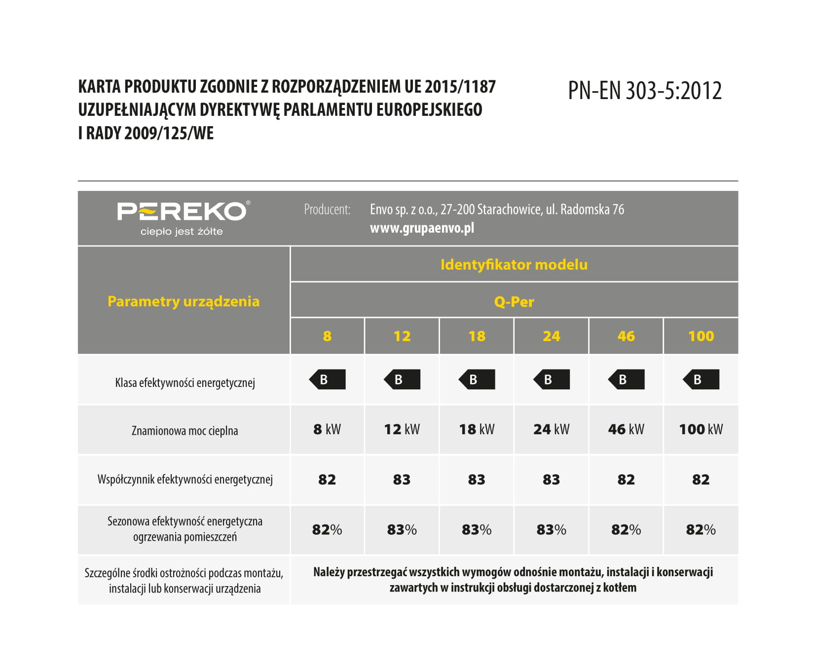 Kocioł PEREKO Q-PER na ekogroszek o niewielkich gabarytach jest przystosowany do pracy zarówno układzie otwartym (grawitacyjnym), jak i w układzie z wymuszonym obiegiem pod warunkiem montażu odpowiednich zabezpieczeń. Korpus kotła wykonany jest z blachy stalowej P265GH przeznaczonej do produkcji urządzeń ciśnieniowych oraz w podwyższonej temperaturze. Kontrukcja wymiennika ciepła pozwala na łatwe w czyszczenie, górne drzwiczki (przy większych mocach środkowe drzwiczki) wykorzystywane są do czyszczenia wymiennika ciepła, a dolne do wybierania popiołu. Zewnętrznymi panelami mocowanymi do podstawy kotła osłonięte są części mechanicznych kotła, jak również poprawiają estetykę. Malowanie proszkowe paneli, zapewnia im odporność na temperaturę oraz chroni przed korozją.