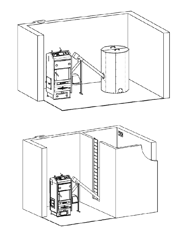 Kotły zostały zaprojektowane w sposób umożliwiający umieszczenie podajnik po prawej lub lewej stronie kotła. Pellet jest pobierany ze zbiornika za pomocą podajnika ślimakowego. Zbiorniki pelletu dostępne są o pojemności 250L, 500L lub 1000L. Jeśli zapotrzebowanie jest większe, istnieje możliwość przekształcenia części kotłowni w zbiornik na pellet.
