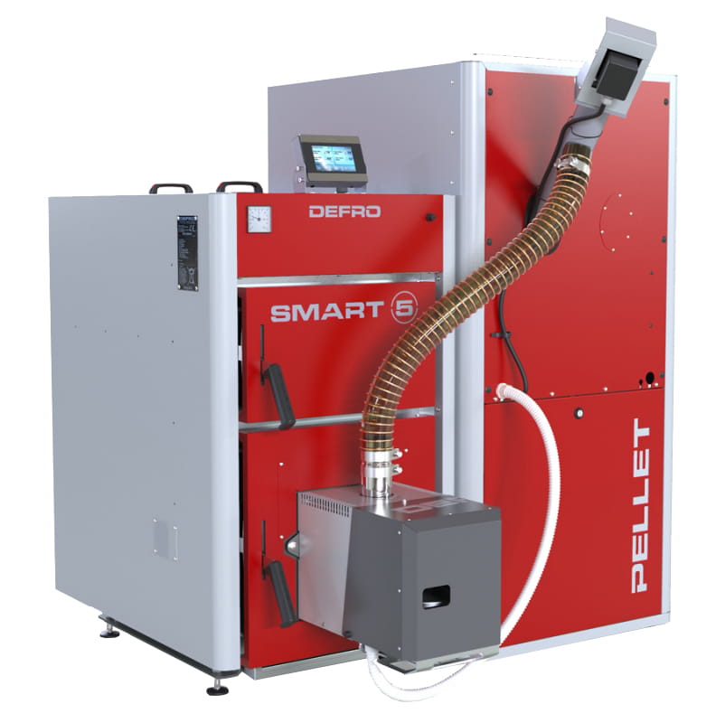Kocioł automatyczny na pellet Defro Smart Ekopell posiada wzmocnioną konstrukcje oraz wbudowaną wężownice schładzającą umożliwiając bezpieczną pracę w układzie zamkniętym. Palnik pelletowy wykonany został z najlepszych materiałów, posiada funkcję automatycznego czyszczenia oraz dwie zapalarki w standardzie (Twin Spark System). Kocioł wyposażony został w innowacyjny sterownik z kolorowym i dotykowym wyświetlaczem obsługujący 6 pomp. Posiada też wysoką sprawność sięgającą 90%. Zasobnik kotła posiada czujnik rezerwy paliwa, przy minimalnym poziomie paliwa praca kotła zostaje zatrzymana, a po ponownym załadowaniu paliwa rozpalanie odbywa się automatycznie.