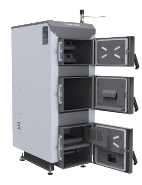 Kocioł dolnego spalania wykonano z certyfikowanej stali kotłowej, a jego korpus wodny oparto na wytrzymałej konstrukcji z wielociągowym systemem kanałów spalinowych. Pionowy wymiennik ciepła wyposażony w turbulizatory zwiększa skuteczność przekazywania energii cieplnej oraz redukuje ilość emitowanych szkodliwych substancji. Stały ruszt żeliwny gwarantuje trwałość, a także ułatwia czyszczenie urządzenia.