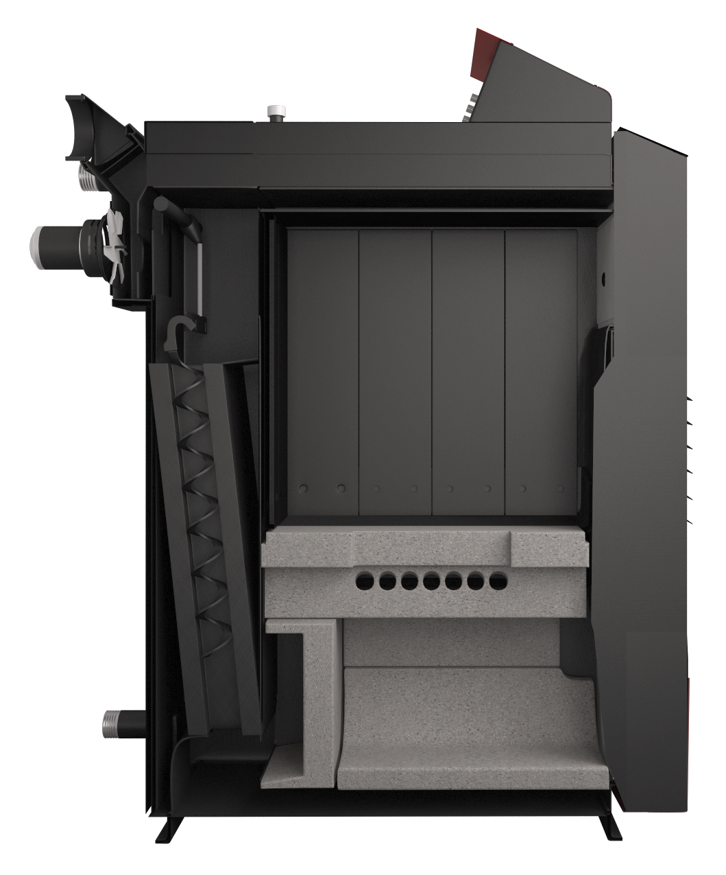 ATTACK SLX wyposażony jest w wysokosprawny rurowy wymiennik cieplny z turbulatorami, które przyczyniają się do wysokiej sprawności kotła. Dodatkowo turbulatory zadbają za ciebie o czysty wymiennik w wersji SLX LAMBDA Touch. Kocioł wyposażony został również w ochronę przed wydzielaniem się smoły, o którą dba suchy płaszcz, umieszczony na obwodzie całej komory załadunkowej.
