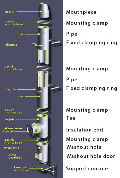 - płaszcz zewnętrzny komina izolowanego wykonany jest z blachy kwasoodpornej (1.4301 błysk)