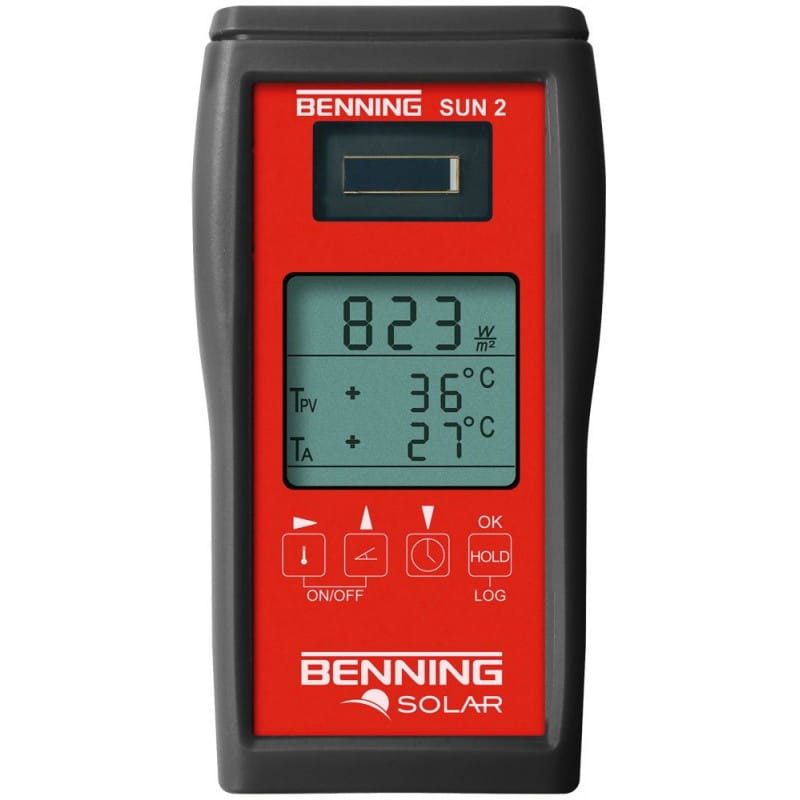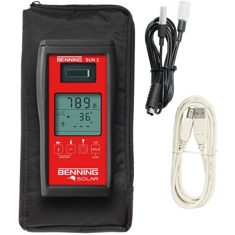 BENNING SUN 2 to urządzenie idealnie podczas planowania, odbioru jak i okresowych przeglądów sieci systemów fotowoltaicznych zainstalowanych zgodnie z normą EN 62446. Urządzenie współpracuje w miernikami BENNING PV 1-1, BENNING PV 2 oraz BENNING PV 3. Pomiar nasłonecznienia (W/m) przeprowadzany jest zgodnie z normą EN 62446 dla systemów fotowoltaicznych i systemów solarnych. Miernik posiada dwukanałowy czujnik temperatury, który pozawala na jednoczesny pomiar temperatury modułu PV jak i otoczenia. Zintegrowany kompas oraz inclinometer umożliwia dokładny pomiar orientacji dachu jak i kąta nachylenia. Pamięć miernika jest w stanie pomieścić 5000 wskazań, a wbudowany zegar czasu rzeczywistego z datą ułatwia ich identyfikację.