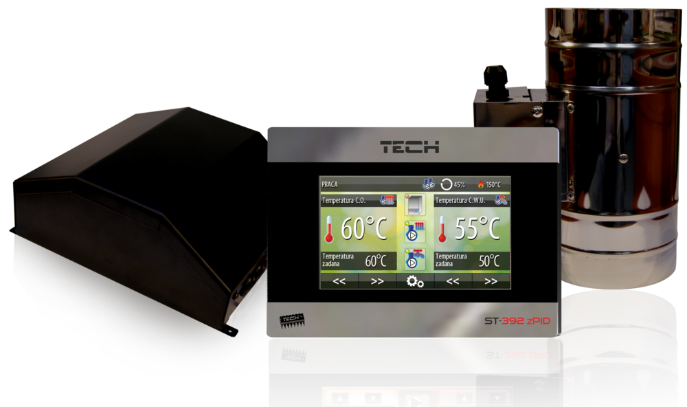 Regulator temperatury ST-392 z przepustnicą przeznaczony jest do sterowania procesem spalania w domowym kominku grzewczym. Regulator ten steruje pracą pompy obiegowej, pompy dodatkowej (CWU lub podłogowej), przepustnicy oraz wyjściem beznapięciowym (sterowanie dodatkowym urządzeniem).