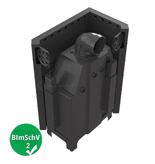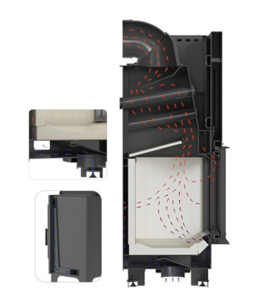 Korpus oraz front wykonane są z wysokiej jakości stali, odpornej na działanie bardzo wysokich temperatur. Wnętrze komory spalania wyłożono materiałem TERMOTEC, który magazynuje ciepło, podnosząc temperaturę spalania i wydłużając jej utrzymywanie. Zastosowanie wysokiego czopucha oraz poziomo ułożonych płomieniówek zwiększa powierzchnię wymiany ciepła między wkładem a otoczeniem, jednocześnie obniżając temperaturę spalin i poprawiając sprawność urządzenia. Drzwi kominka, wykonane z zamkniętego profilu, cechują się dużą trwałością i odpornością na naprężenia. Uszczelka została umieszczona w specjalnie wyprofilowanym kanale, co zapewnia jej stabilne przyleganie i zapobiega wypadaniu podczas użytkowania. Deflektor wydłuża drogę spalin, umożliwiając dopalanie cząstek opału i zwiększając efektywność spalania. Powietrze doprowadzane jest wyłącznie z zewnątrz przez króciec dolotowy o średnicy 125 mm. Regulacja odbywa się za pomocą jednego sterownika, co minimalizuje ryzyko błędnej obsługi. System potrójnego dopowietrzenia obejmuje powietrze pierwotne kierowane na płytę spalania, powietrze wtórne dostarczane przez otwory w tylnej ścianie oraz kurtynę powietrzną, która utrzymuje szybę w czystości.