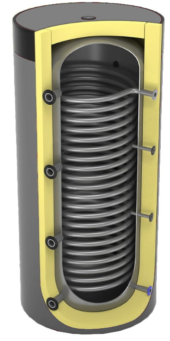 Zbiorniki buforowe z jedną wężownicą typu Maxi charakteryzują się dużą powierzchnią wężownicy, która daje możliwość podłączenia pompy ciepła (niska temperatura cieczy grzewczej) ponieważ ma dużą powierzchnie grzewczą. Jego izolacja została wykonana z pianki poliuretanowej bądź rozbieralnej gąbki PU. Bufor jest umieszczony w estetycznej obudowie dostępnej wkolorze: szarym.